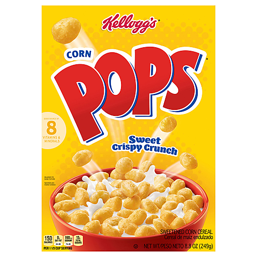Wake up to sweet, crispy Kellogg's Corn Pops. Every irresistible bowl delivers the consistently crunchy, sweetened popped-up corn experience that's been serving up smiles for years. Corn Pops cereal provides a good source of 8 vitamins and minerals and is made with colors and flavors from natural sources. We're proud to say corn is the first ingredient. Corn Pops are fun to eat for the family as a quick breakfast; Serve them in a bowl with milk or your favorite dairy alternative and indulge in a late-night bowlful of sweet, crunchy cereal and finish off with sweet cereal milk. Stash in a small bag for a school snack or in a lunch box as a portable treat. Pour them into a snack bowl for family, game or TV time. Pack a box when you travel or run errands. The delicious sweet, crispy crunch makes Corn Pops cereal a tasty pick-me-up at home or on the move. Any time, any place, "Gotta have my Pops!"