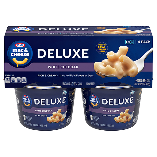 Help yourself to a cup of comfort. Kraft Deluxe White Cheddar Mac and Cheese Dinner Cups are easy and ready in just minutes. Kids and adults love the rich taste and creamy texture of macaroni pasta with cheesy goodness. Easy mac cups include macaroni pasta and white cheddar cheese sauce mix so you have everything you need to make delicious, quick mac and cheese by just adding water. Looking for microwave meals, kids meals or instant mac and cheese? Our macaroni cups are a great choice. With no artificial flavors or dyes, our microwavable macaroni and cheese cups make a perfect snack or a classic meal side. Preparing our microwavable food is a breeze. Just combine the pasta with water up to the fill line in the cup, microwave for 3.5 minutes and stir in the cheese sauce mix. Each sleeve includes four 2.39-ounce microwavable meals. Stir up new ways to enjoy Kraft Mac n Cheese by adding protein, hot sauce, condiments, or seasonings to make it your own. A wholesome tradition, Kraft Mac & Cheese has been bringing generations together since 1937. Kraft Mac and Cheese inspires the positive power of comfort, so keep your pantry stocked with our dinner sides and enjoy cheesy goodness anytime.